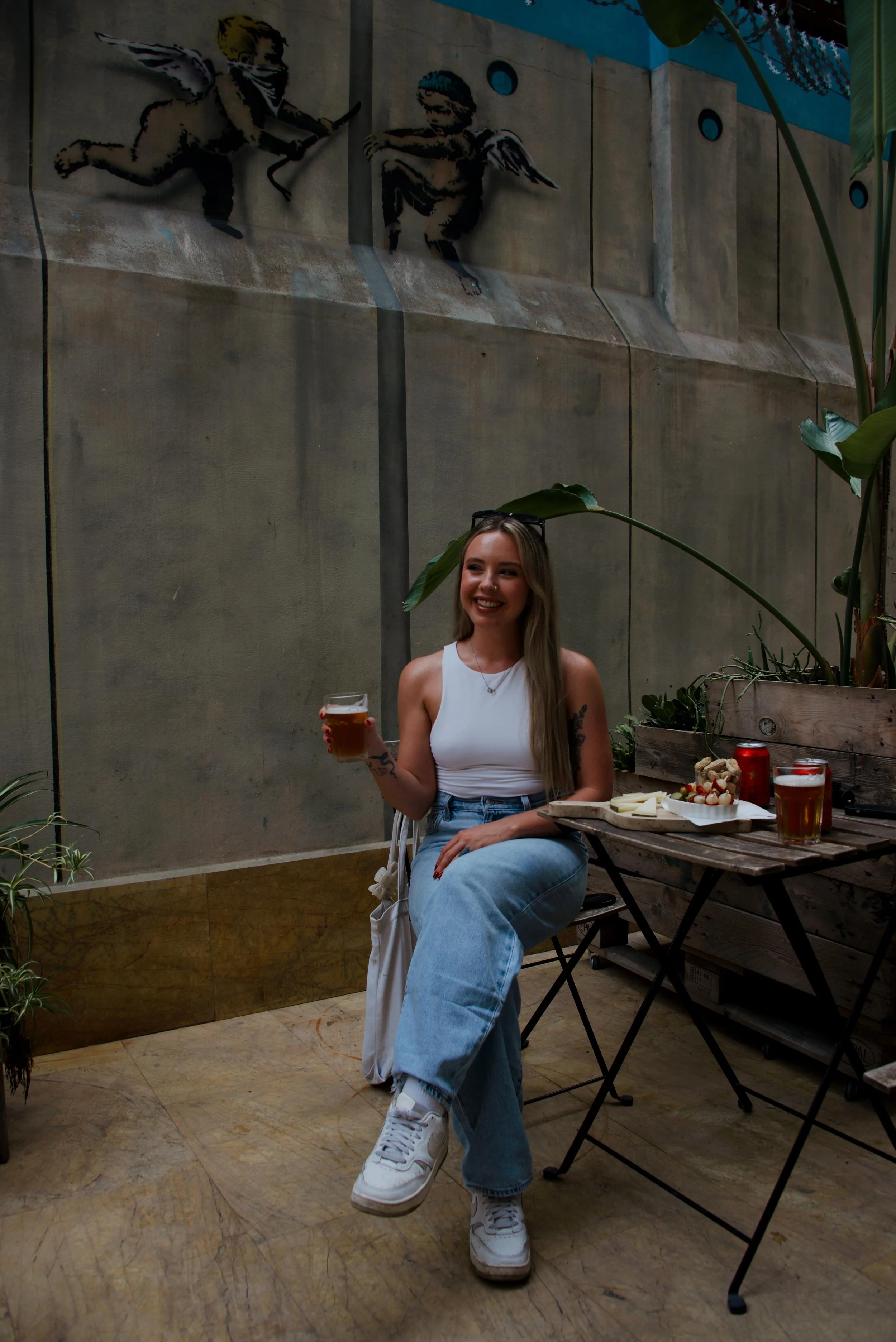 After trotting around the museum, we stepped out for a breath of fresh air. The terrace was draped with plants and dotted with Banksy pieces. I loved spotting the little details - like the fish on the floor and the two angels on the walls.