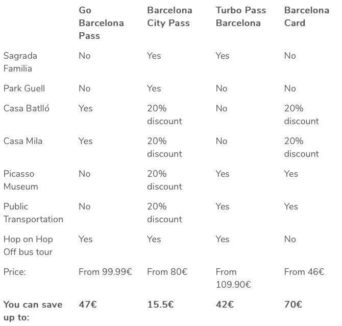 The Go Barcelona Pass doesn’t include entrance to the Sagrada Familia, Park Güell or the Picasso Museum. Public transport is also not included.