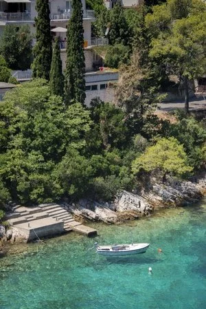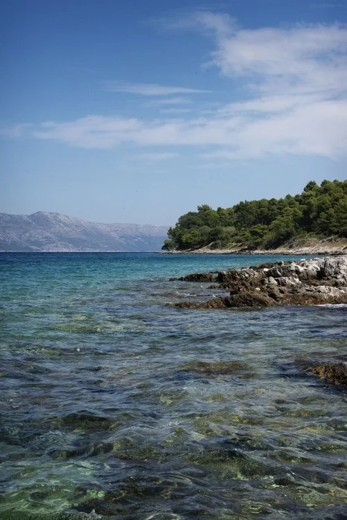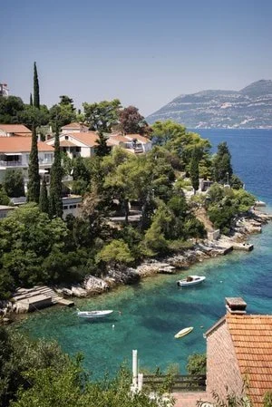 Badija Island is particularly pinned for its Gothic-esque, 14th-century Franciscan Monastery, with verdant forest and jagged mountains serving as a background.